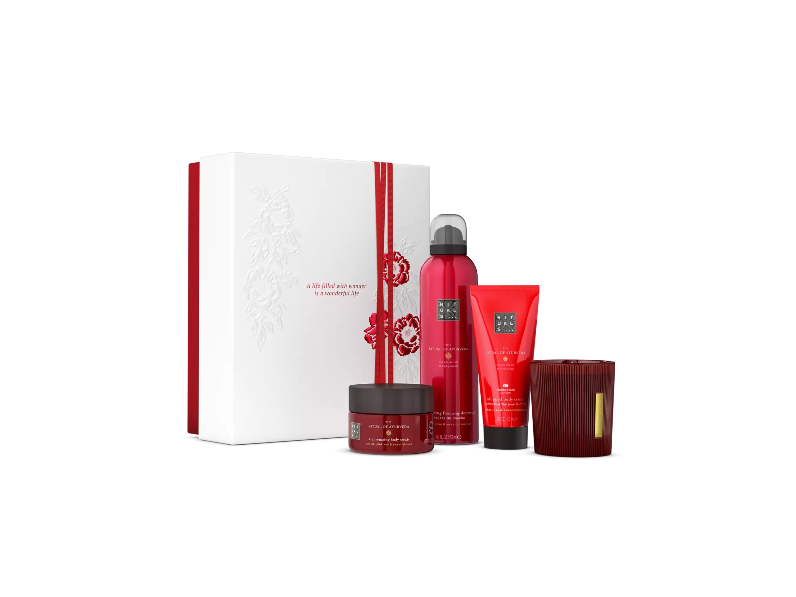 The Ritual of Ayurveda Medium Gift Set savršen je poklon za sve koji traže ravnotežu tijela, uma i duše. Inspiriran drevnom indijskom filozofijom Ayurvede – jednim od najstarijih holističkih sistema njege – ovaj luksuzni kozmetički set obogaćen je mirisima indijske ruže i ulja slatkog badema, koji zajedno djeluju umirujuće na kožu i osjetila. Idealan kao poklon za žene i muškarce koji cijene prirodnu njegu i trenutke autentičnog opuštanja.